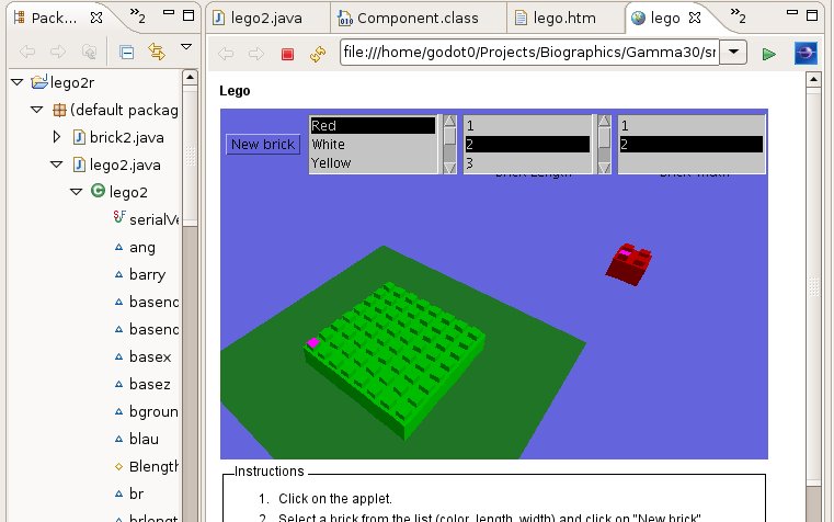 Jlego is a little 3D toy that let you stack Lego bricks on a field. Jlego is a Java applet available for instance here. It has been developped by Fraser Danbury, without any clear license. And Mr Danubury's email is not valid anymore... So here is Jlego_r, a re-compiled version of Jlego on J2SE 1.5. I will distribute the sources as soon as I get the agreement from the author.